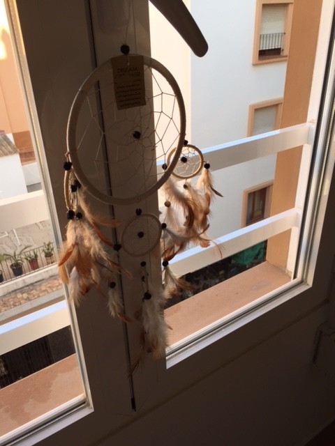 ふわふわ羽飾りがお洒落でシックな色合いがインテリアにも。けっこう大きいので存在感あります。悪いことから身を守ってくれるそうです♪ベッドルームやこんな風に窓辺に飾っても素敵!